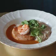 Pass the bread, onion, cod, and half of the shrimp through a coarse grinder. Set aside a few shrimp for serving, and chop the remaining ones into large cubes.