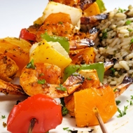Season the shrimp with salt and pepper. On skewers, alternate threading shrimp, pieces of red pepper, pieces of onion, and diced mango.