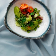 The assembly principle of this salad, inspired by a renowned chef, mirrors all the beloved and established recipes: edamame beans, broccoli, salad greens, grilled royal shrimp, and, of course, the ubiquitous avocado. Everything is crunchy, refreshing, and beautifully arranged on the plate. A fragrant dressing made from apple puree, mixed with a nearly perfumed dose of lemon and lychee, brings originality to what might seem like a standard combination of ingredients.