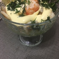 Drizzle the salad with mayonnaise, garnishing with shrimp, herbs, and a slice of lemon.