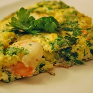 Heat the olive oil in an oven-safe skillet. When it starts to foam, pour in the egg mixture. Stir the eggs. Place in the oven for about 5 minutes. Preheat the oven to 428°F. Beat the eggs with salt and pepper, add parsley, lemon zest, juice, and Parmesan. Add the shrimp to the eggs, some of them can be chopped into pieces. In a small oven-safe skillet, heat both oils until foamy, pour in the egg mixture. On medium heat, gently stir the eggs for about a minute, then place the skillet in the oven. For about 5 minutes, do not overcook! Sprinkle with chili and serve.