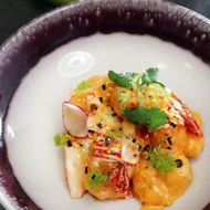 Arrange on plates, add cilantro leaves, thinly sliced radishes, and tobiko caviar. Sprinkle with furikake, a Japanese seasoning for rice.
