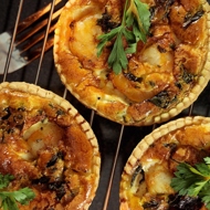 Peel the shrimp. Mix them with parsley and garlic. Place diced Emmental cheese into the pastry shells. Evenly distribute the shrimp mixture on top (three shrimp per tart) and pour over the sauce, allowing it time to soak into the filling.