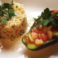 Avocado salad: Cut the avocado in half, hit the pit with a spoon to easily remove it. Scoop out the flesh with a spoon and cut it into cubes. Add the diced tomatoes and 100 g of cooked shrimp. Mix, add salt and spices to taste, and place back into the avocado skin.