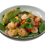 On a plate, arrange the spinach, then add the quinoa on top, followed by the avocado. In the center, place the shrimp, drizzle with dressing, and garnish with cilantro leaves.