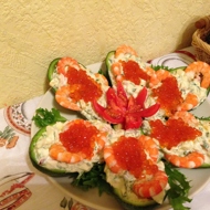 Cut the avocado and cucumber into strips, add the onion, 1 tablespoon of red caviar, sour cream, salt, pepper, herbs, and mix.