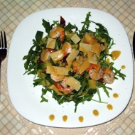 On a plate, mound the arugula, then arrange the avocado pieces, sun-dried tomatoes, shrimp, and cheese. Drizzle with the dressing.