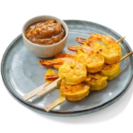 Quickly grill the skewers on a preheated barbecue or grill for 3 to 5 minutes on each side, depending on the heat.