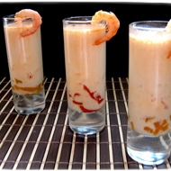 In the bottom of very small cups, place 1 teaspoon of chopped peppers and a few shrimp.
