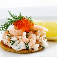 Spread the mixture over the toasted slices of bread. Top each toast with a few shrimp and a spoonful of caviar. Garnish with a sprig of dill and a lemon wedge.