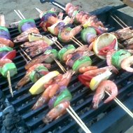 Cut the lemon, onion, zucchini, and pepper, and marinate with the tiger shrimp for 1 hour. For the marinade, mix the dry white wine, rosemary, sumac, and finely chopped garlic. Then thread onto skewers, season with salt, drizzle with olive oil, and grill until cooked through.
