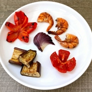 Arrange the shrimp with vegetables on a baking sheet, brush with the spicy sauce, and place in a preheated oven at 392°F.