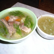Take the ribs, cover them with water, and put them on the heat. When it boils, add the bay leaf and pepper to the broth, and season with salt.