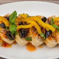 Chop fresh ingredients (spinach, arugula, tomatoes, red basil, red onion), gently mix, and drizzle with olive oil.