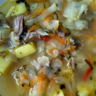 Put the meat broth to boil. After 1 1/2 to 2 hours of boiling, remove the meat and strain the broth into a soup pot, where you have previously placed sautéed root vegetables and onions; then add the meat back in, add the chopped cabbage, and cook for another 30-40 minutes. 5-10 minutes before the end of cooking, add pepper, bay leaf, and salt to the soup.