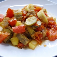 Peel the eggplants, zucchini, cucumbers, and tomatoes, then cut them into large cubes.