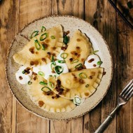 Serve the dumplings with sour cream, topped with crispy bacon and finely chopped green onions.