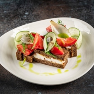 Spread mustard on slices of Borodinsky bread, place a fairly thick piece of lard on top, and cover it with a second slice of bread to make a sandwich. Trim the crusts to form a square shape and cut the sandwich into three pieces. Arrange the mini sandwiches on a plate.