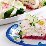 The sandwich cake entered Swedish cuisine in the 1940s and has become as traditional a festive appetizer as Olivier salad is in Russian cuisine. Smörgåstårta is prepared for various celebrations, but most often for christenings and birthdays. There are thousands of variations in fillings, shapes, and decorations; this is just one example.