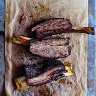 Place the ribs in the smoker with the meat side facing up, leaving at least 5 cm between each piece. Smoke for 8–10 hours until the ribs are dark brown on the outside and very tender on the inside. To check for doneness, insert a metal skewer into the largest rib (from one side, parallel to the bone); it should easily penetrate the meat. Alternatively, place a digital thermometer probe parallel to the bone without touching it. The temperature should reach 194°F. The finished meat will shrink in size and pull away from the end of the bone by 2.5–5 cm.