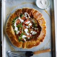 Drizzle the salmon with the sour cream dressing and sprinkle with arugula or watercress. If desired, the tarts can be placed back in the oven for a few minutes to warm them up before serving. In this case, the salad should be served separately.