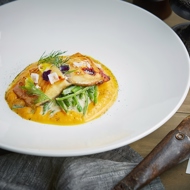 Smoked White Sea Halibut with Crispy Bean Salad and Spicy Pumpkin Cream