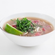 Strain the broth, return it to the stove, bring it to a boil, and add flat rice noodles. Cook for five minutes.