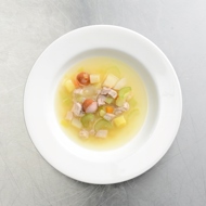 Peel the celery root, carrot, and potato, then chop them into medium cubes. Rinse the leek and slice it into large half-moons.