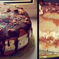 For the glaze, melt the butter in a double boiler. Add cocoa powder and sugar to it. Once the sugar has dissolved, add sour cream and mix thoroughly.