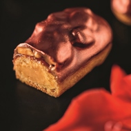 Assembly and decoration. Fill the éclair with caramel cream. Glaze the éclair with caramel icing. Attach caramel-coated peanuts on top of the icing. Place the éclairs in the freezer. Melt the chocolate and add cocoa butter. Dip the frozen éclairs halfway into the glaze at any temperature. Using a fluffy brush and bronze luster, dust the chocolate part of the éclair. Transfer to the refrigerator until fully thawed.