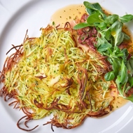 Cut the potatoes into fine strips, mix with herbs, salt, and pepper, and fry in olive oil like a thin pancake.