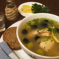 Prepare the soup base. Finely chop the onion and carrot. Sauté in a heated pan with olive oil. Add a tablespoon of flour, then a bit of fish broth. Stir, add the olives, green olives, capers, chopped pickled cucumbers, and remove from heat.