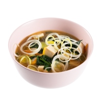 Take half a cup of broth from the pot and dissolve the miso paste in it, then add the mixture back to the soup to taste. Alternatively, you can dilute it in each bowl, garnishing each serving with thin rings of leeks.