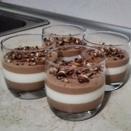 Take a glass, pour in part of the chocolate mixture, and place it in the refrigerator for about 15 minutes to thicken. Then pour in the milk mixture and return it to the refrigerator. After the second layer has thickened, pour in the chocolate mixture again and place it in the refrigerator.