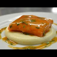 Remove the fish from the bag, carefully peel off the skin. Heat a plate, place the purée in the center, top with the fish, and drizzle with the sauce.