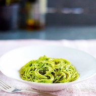 Cook the spaghetti in a large pot of boiling salted water until al dente (for 60-70% of the time indicated on the package). Meanwhile, heat the butter and garlic mixture and add a tablespoon of pesto.