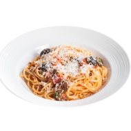 Spaghetti alla Puttanesca can be roughly translated as 'spaghetti with a kick.' There are many stories about its origin, from wise women who created the dish to attract customers to a chef who accidentally threw together a sauce with whatever ingredients were available, as often happens. This is a great option when classic pasta with tomato sauce feels too familiar, and you want to achieve a bolder flavor. Don't skimp on the capers, garlic, or anchovies with olives—the sauce should be very rich to thoroughly coat the pasta.