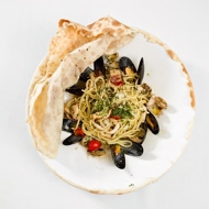 Serve the spaghetti at the table under a dome, and only cut it just before eating: those few seconds after lifting the lid off the pasta, when a dense steam rises from the plate carrying the aroma of the warm sea, hold the true essence of the entire experience. You can achieve a similar effect by baking the plate in a parchment bag, but of course, it’s not nearly as visually appealing.