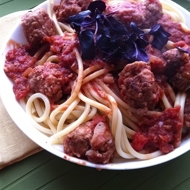 While the meatballs are cooking, boil the spaghetti in salted boiling water. Drain.