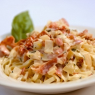 Serve in two ways: 1) Place the pasta on a plate, drizzle with the ham sauce, and sprinkle with the remaining cheese; 2) Combine all the pasta in a large deep dish, add the bacon sauce, mix well, and then serve on plates, garnished with cheese.