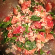 Drain the oil from the tuna can and break the tuna into large pieces with your hands into the tomato mixture. Season with salt and pepper to taste and gently mix.