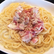 Spaghetti in Cream Sauce with Pesto and Bacon