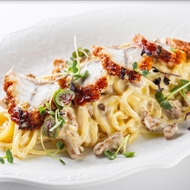 Serve the pasta with chanterelles on plates, topped with slices of eel and your favorite herbs.