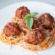 While the sauce is coming to a boil, make the meatballs: with damp hands, shape 10 balls about 4 cm in diameter. Place them into the boiling sauce, then reduce the heat so that the sauce is barely simmering. The meatballs should be half submerged in the sauce. If necessary, you can add a little water to make the sauce slightly thinner. Cook the meatballs covered for 20–25 minutes, turning them every 5–7 minutes, until fully cooked.