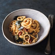 Add the pasta to the saucepan and stir until the sauce reduces slightly, becomes creamy, and coats the pasta, about one minute. If necessary, add a little pasta cooking water to achieve a creamy sauce.