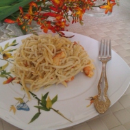 In the water where the shrimp were cooked, add the spaghetti and wait for it to boil, cooking for 10–15 minutes (you can also add spices to taste).