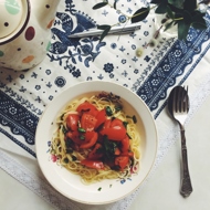 Serve the spaghetti in a deep plate, topped with the tomatoes and ramps.