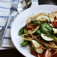 Cook the spaghetti until al dente. Slice the zucchini into rounds or halves, and cut the cherry tomatoes into wedges.