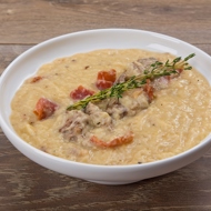 Ladle the soup into bowls, garnish with a sprig of thyme, and serve hot.