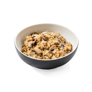 Add the sautéed champignon mushrooms (saving a few for garnish), season the porridge with salt and pepper to taste, and stir.